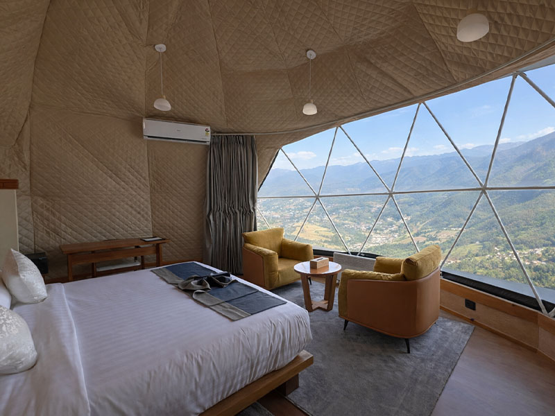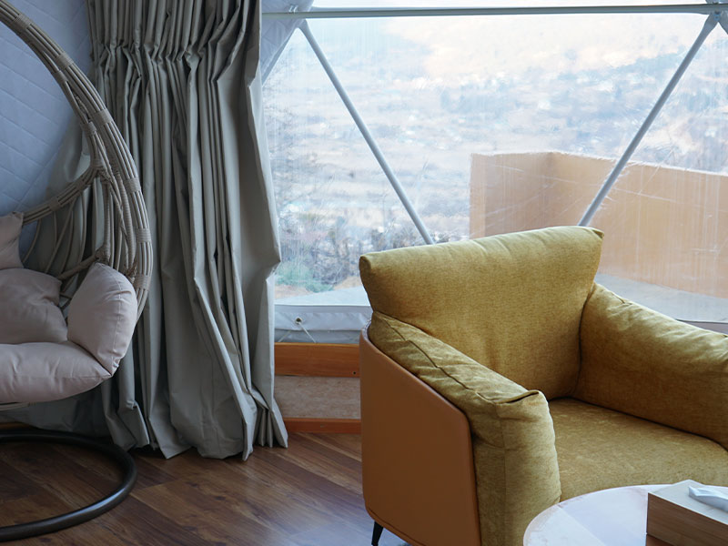 Hilltop View Domes provide expansive views of the valley, mountains, and open sky from the highest point on the site. There aren't many domes, so the experience is intimate and leisurely. Here, areas remain serene and uncrowded, attention is given thoughtfully without interference, and the pace is determined by nature rather than a set timetable. A unique viewpoint characterized by comfort, quiet, and altitude.