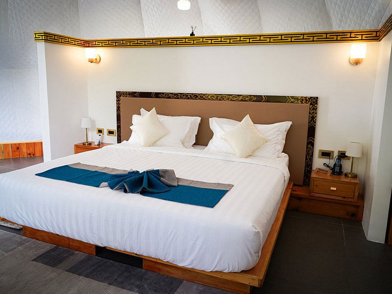 Standard Superior Domes are designed to be a comfy haven with all the amenities required for a peaceful and comfortable stay. A well-appointed bedroom area, a private veranda, and natural materials combine to create a peaceful, calming atmosphere. These domes, which are straightforward, cozy, and well-thought-out, provide a tranquil starting point for seeing Bhutan and an equally welcoming destination to return to at the end of the day.